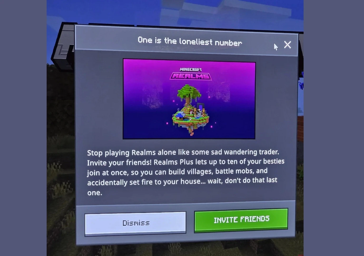 Пользователь Reddit поделился всплывающим окном и заявил, что такая подача — настоящая насмешка над теми, кто играет в одиночку. Многие фанаты Minecraft используют песочницу как способ на время уйти от реальных проблем, в том числе социальных. Особенно ярко одиночество чувствуют люди с депрессией.