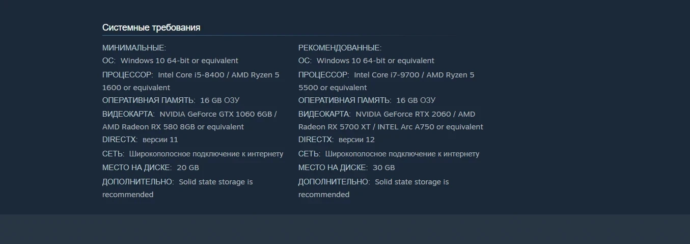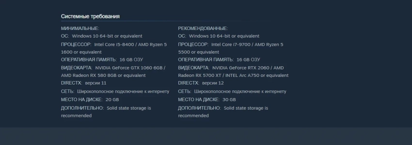 • видеокарта: NVIDIA GeForce RTX 2060 / AMD Radeon RX 5700 XT / INTEL Arc A750 или аналог;